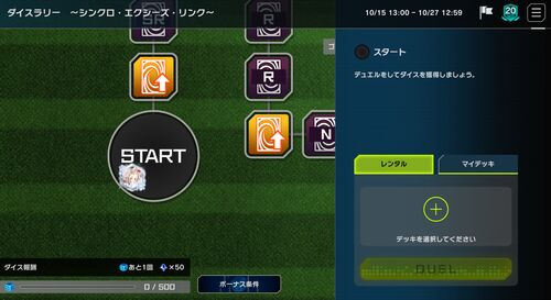 『ダイスラリー~シンクロ・エクシーズ・リンク~』ダイスを振ってゴールを目指すイベントで累計獲得ダイス数や周回数で報酬を受け取れます。 デュエルをするとポイントを獲得し500ポイントにつきダイスを1個獲得出来ます。ボーナス条件があるのでなるべく当…